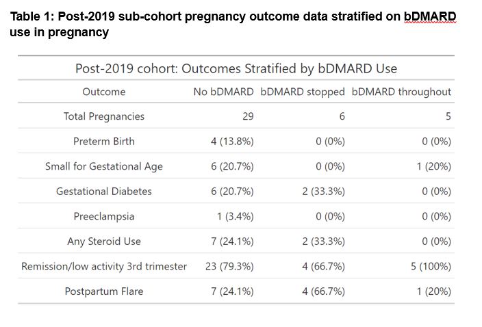 Table 1 summarises the post-2019 sub-cohort outcomes of individuals not on bDMARDS, compared to those on bDMARDs who either stopped or continued therapy in pregnancy. It illustrates that maternal complications are highest in those who discontinue bDMARDs in pregnancy (i.e., least likely to achieve remission/low disease activity in the 3rd trimester; and highest rates of steroid use, GDM and postpartum flare). Fetal complications however were highest in those mothers not on bDMARDs (i.e., highest rates of SGA and preterm birth).